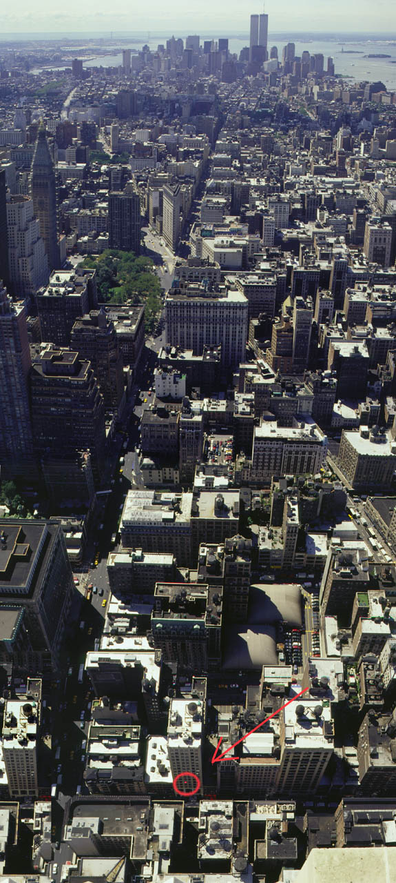 Looking South, you can see the World Trade Centers in the distance, and our hotel room indicated by a red arrow.